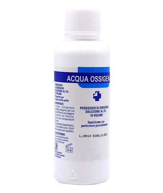 Flacone di acqua ossigenata: perossido di idrogeno stabilizzato, soluzione diluita al 3% 10 volumi.