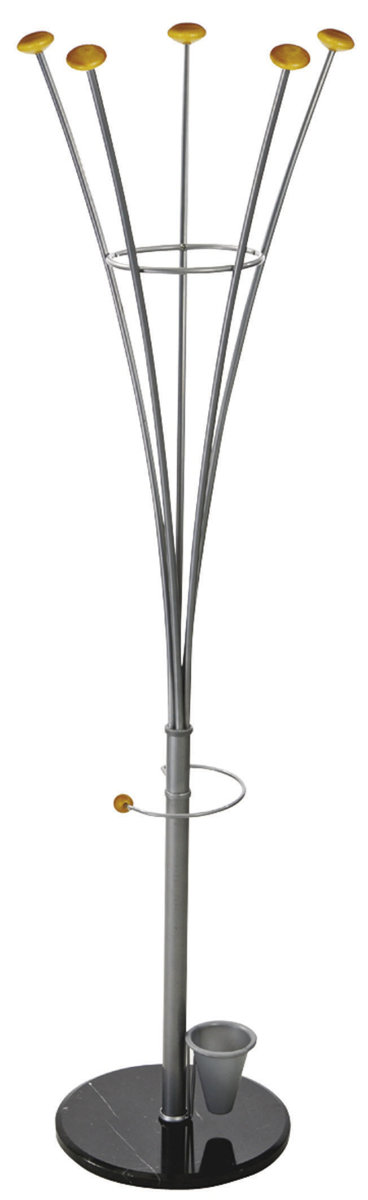 Realizzato in metallo satinato con una solida base in marmo scuro da 38 cm > Dotato di 5 pomelli per appendere gli abiti e di portaombrelli con vaschetta raccogli goccia > Altezza 188 cm