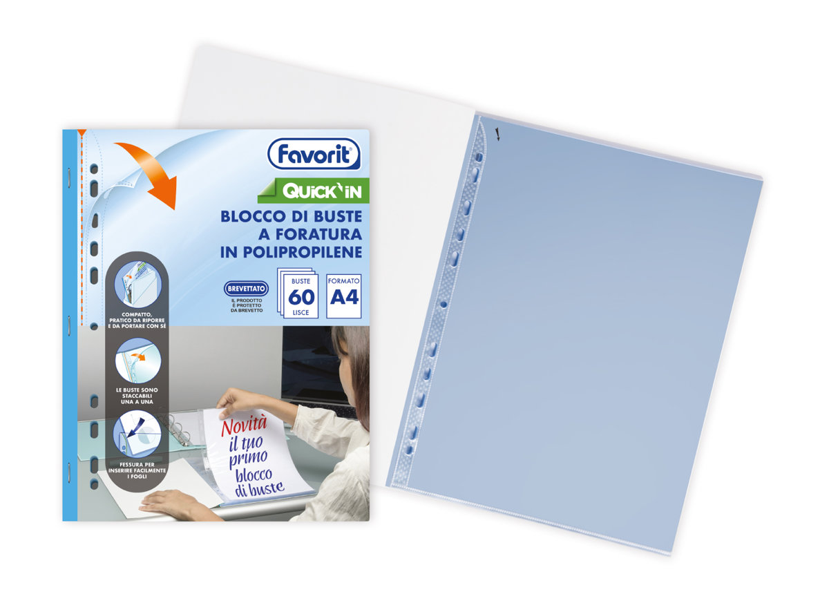 Blocco di buste a foratura universale realizzate in polipropilene, dalla finitura liscia ultra trasparente.