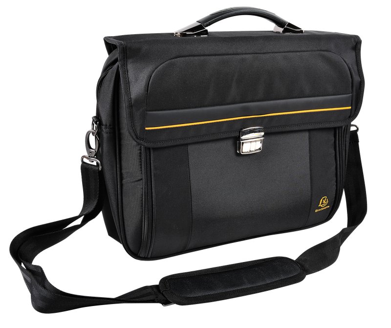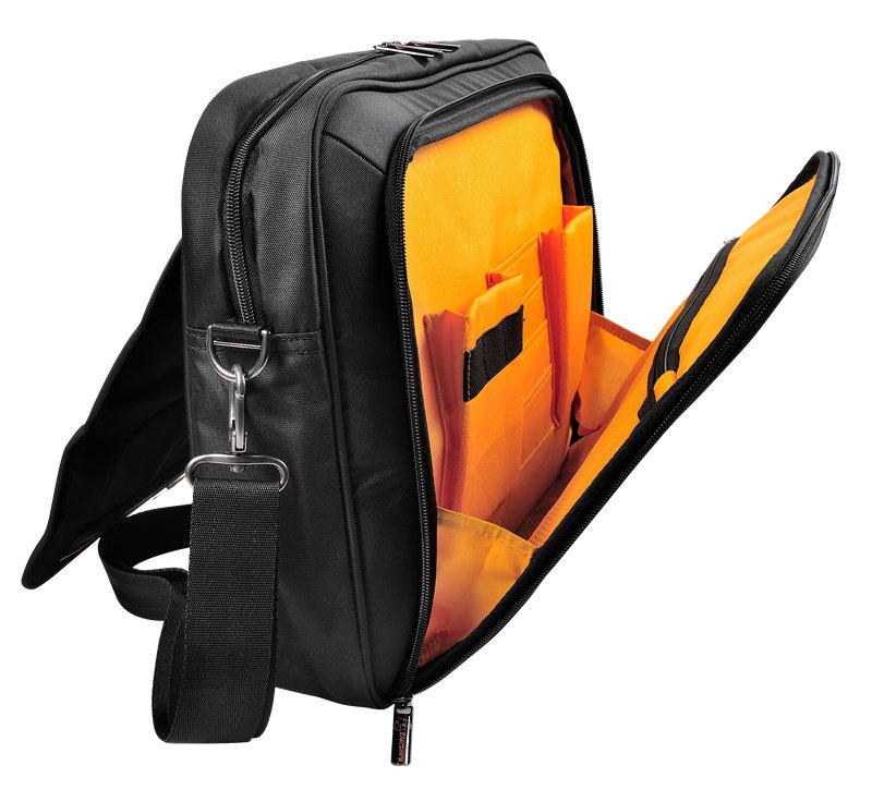 Borsa portacomputer realizzata in resistente poliestere • comparto interno con vano portacomputer imbottito e chiusura a zip • grande tasca frontale attrezzata con cerniera di chiusura • manico ergonomico • tracolla removibile • patella di chiusura con clip in metallo • tasca sul retro per l'inserimento sul manico dei trolley • dimensioni borsa cm 43x37x10 • dimensioni comparto portacomputer cm 41x30x4 • colore nero con interno e finiture arancio