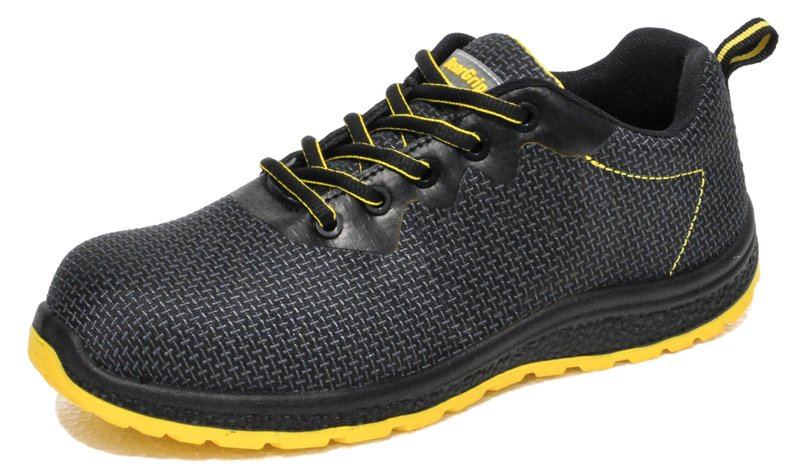 ISO EN20345:2011 Tomaia in mesh traspirante S3 • linguella imbottita • lacci arrotondati • occhielli in plastica pressata • suola iniettata PU antiscivolo SRC • suola tessile e puntale in fibra di vetro • completamente metal free