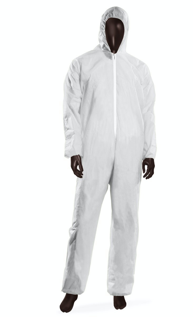 Tuta intera con cappuccio fisso, elastico stringicaviglia e stringipolso, chiusura con cerniera.
