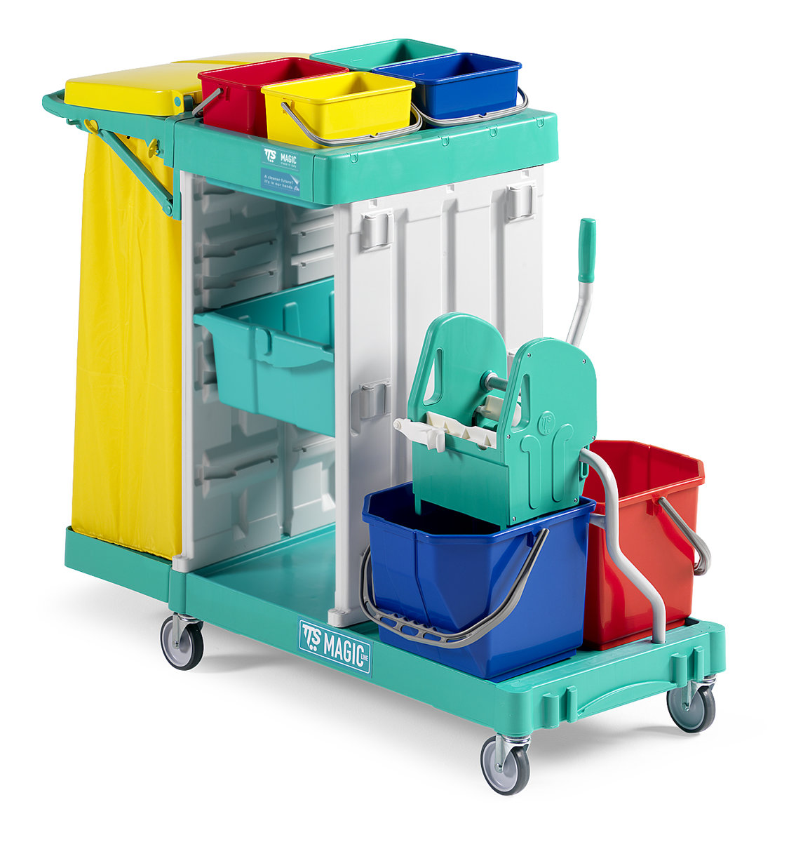 La vaschetta centrale con fondo funge da contenitore per i secchielli di lt 4, caduno (blu, rosso, verde, giallo)