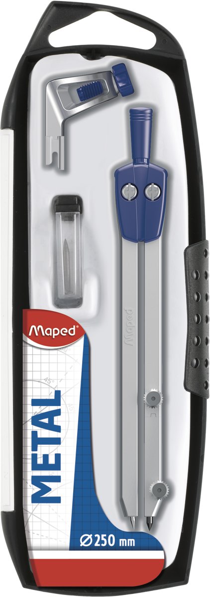 Compasso per uso scolastico realizzato in metallo e plastica. Composto da 3 pezzi: compasso con mina, adattatore universale, astuccio con una mina.