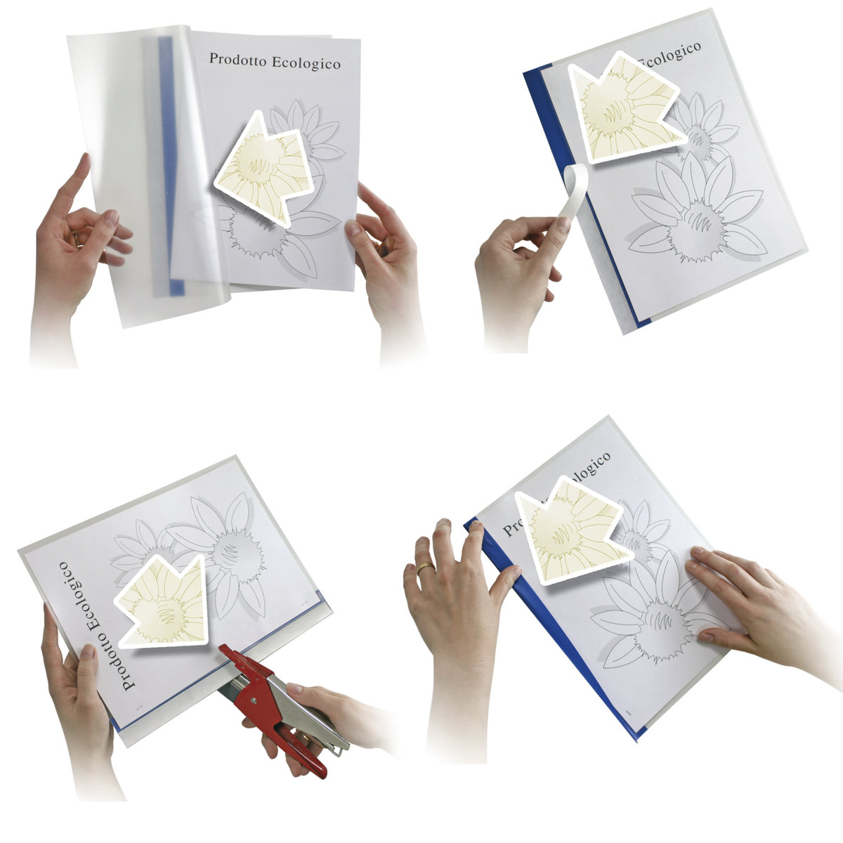 E' sufficiente pinzare i fogli da rilegare con una cucitrice a punti metallici e ricoprirli con queste copertine dotate di dorso adesivo