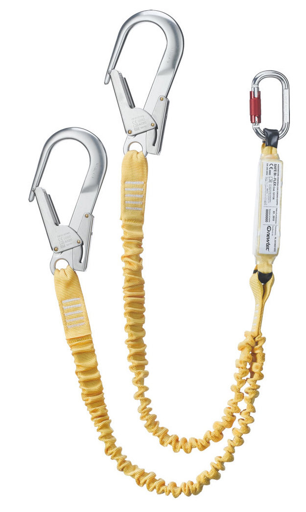 Cordino anticaduta a due punti di ancoraggio con fascia elastica e assorbitore di energia