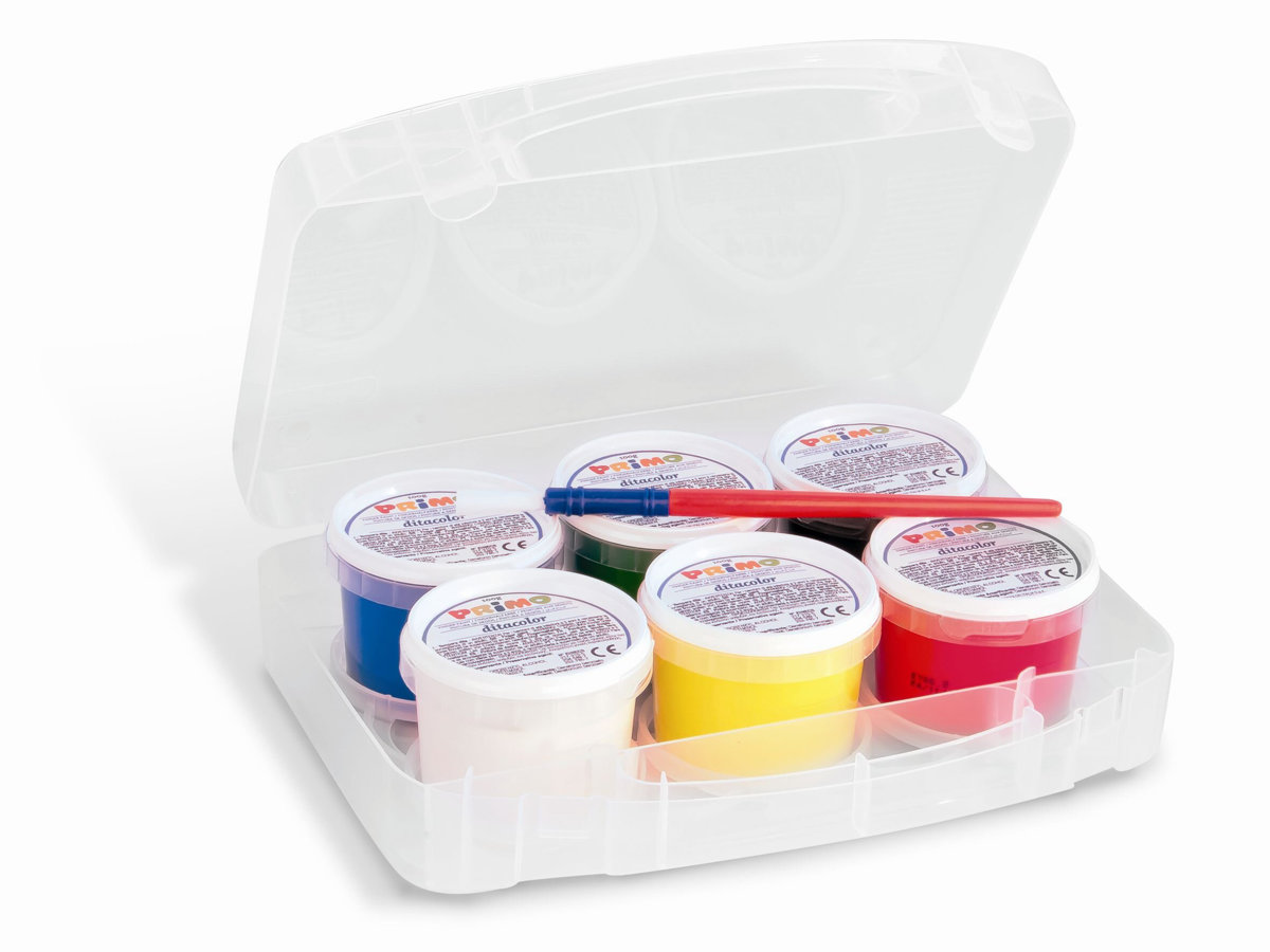Vasetti di colori ad acqua pronti all'uso, adatti alla prima infanzia e per un uso scolastico in genere; confezione in pratica valigetta in plastica con 1 pennello e 6 vasetti da 100gr nei colori rosso, blu, verde, giallo, bianco e nero