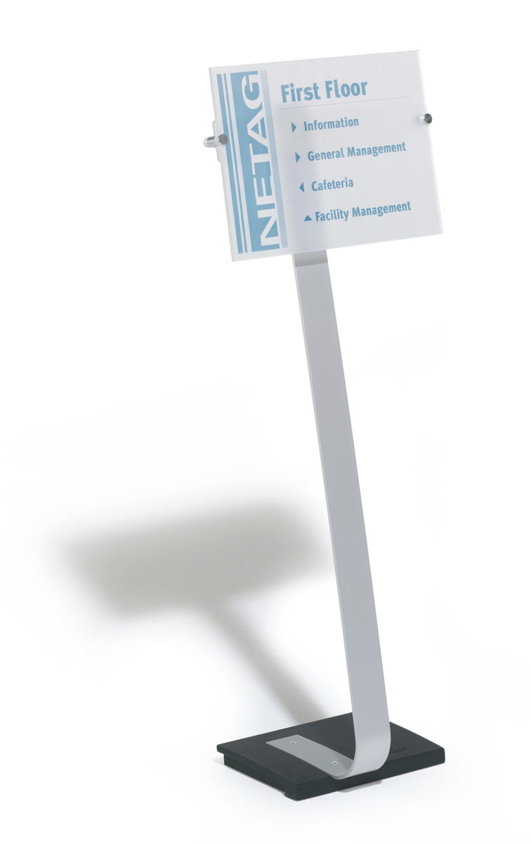 Elegante espositore da pavimento di alta qualità realizzato in alluminio con pannello in acrilico trasparente antiriflesso e base antiscivolo in ghisa che assicura la perfetta stabilità grazie anche ai piedini in gomma