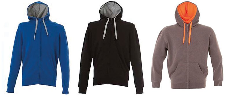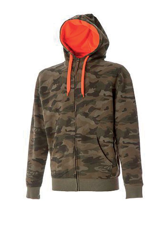 Felpa cotone e poliestere • cappuccio foderato in jersey con cordini in contrasto • colletto rialzato • zip lunga coperta • tasche a marsupio • nastro di rinforzo interno collo • nastro in contrasto interno lungo la zip • polsini e fondo maglia in costina elasticizzata • cuciture ribattute GRAMMATURA: 280 g/m²