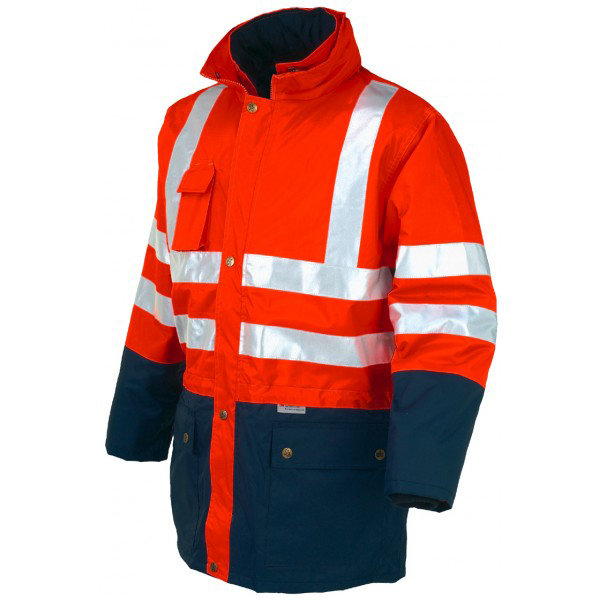 Composizione: - tessuto principale (giallo fluo / arancio fluo): 300D poliestere oxford spalmato PU impermeabile e traspirante con - trattamento TEFLON - tessuto di contrasto (blu marino): 210D nylon oxford spalmato PU impermeabile e traspirante con trattamento TEFLON - fodera corpo: tessuto a rete 100% poliestere, fodera maniche: poliestere taffeta