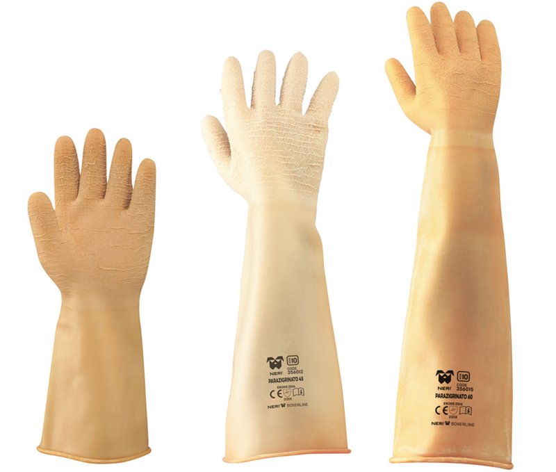 Guanto interamente in lattice • palmo e dorso con finitura increspata • interno liscio • bordino salvagoccia • utilizzato soprattutto nelle concerie e la variante da 60 cm nel processo di sabbiatura
