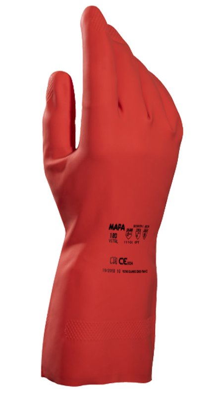 Guanto in lattice naturale misto nitrile • confortevole e resistente agli oli e ai grassi • confortevole floccatura in cotone • finitura clorinata per una migliore protezione dei prodotti manipolati • adatto al contatto alimentare • lunghezza cm 31 • spessore mm 0,40