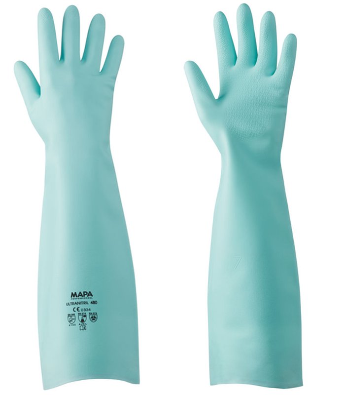 Guanto in nitrile • finitura interna clorinata • zigrinatura esterna antiscivolo • ottima protezione chimica • lunghezza cm 46 • spessore mm 0,55
