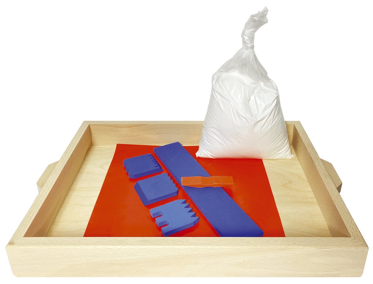 Composto da un vassoio, 5 spatole di diversa forma e una confezione di sabbia speciale per il gioco e la manipolazione