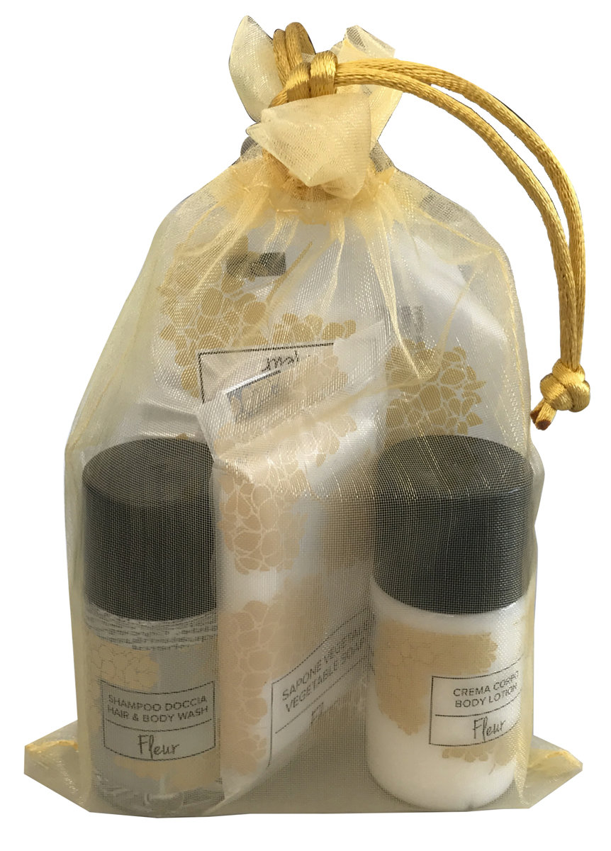Il Kit assortito comprende 1 pezzo cad. di tutta la linea Fleur: lo shampoo doccia e la lozione corpo sono presentati in flaconcini monodose da ml 20, la saponetta, profumata e gradevole al tatto, proposta in formato tondo e grammatura da gr 15, in bustina con chiusura flow pack