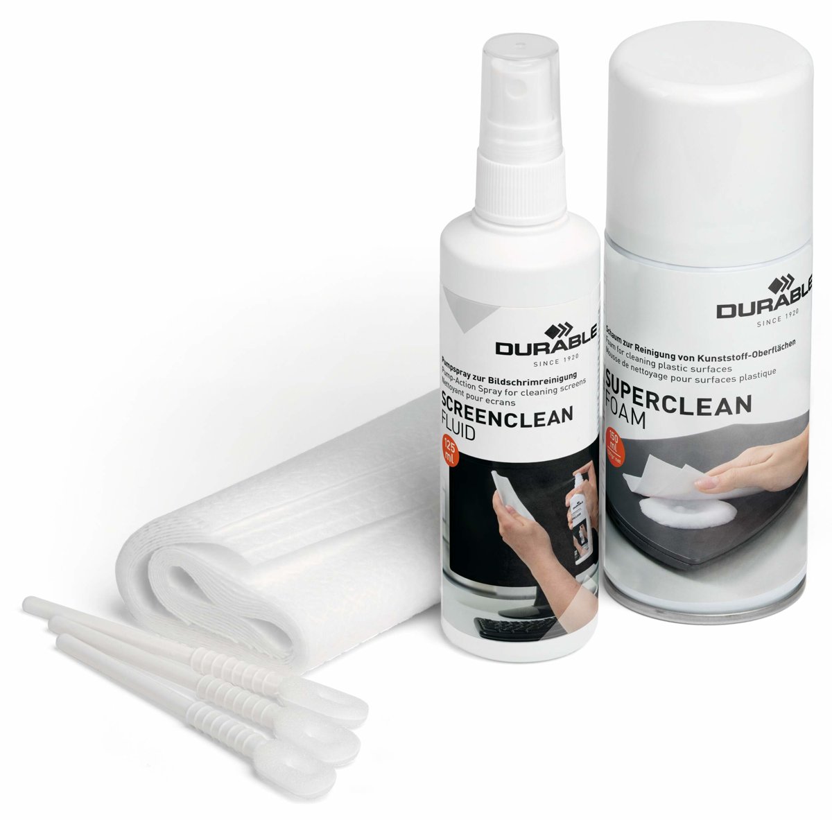 La confezione include: spray detergente da 125ml per lo schermo, schiuma detergente multisuperfici da 150ml, 10 panni assorbenti, 3 spatoline per la pulizia della tastiera
