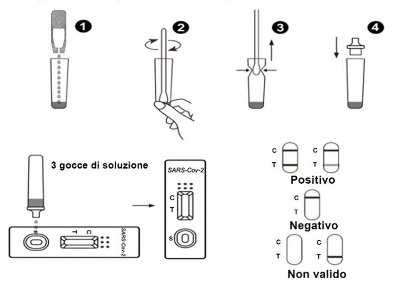 Test rapido a cassetta per la rilevazione qualitativa l'antigene del nuovo Coronavirus (SARS-Cov-2) nel tampone nasofaringeo e in quello orofaringeo • il test rapido a cassetta (tampone) utilizza il metodo immunocromatografico rapido • l 'identificazione si basa sugli anticorpi monoclonali specifici dell'antigene del nuovo coronavirus • il dispositivo di test è composto da tre parti, vale a dire tampone per campione, tampone per reagente e membrana di reazione Solo per uso professionale diagnostico in vitro Dispositivo Medico registrato al Ministero della Salute