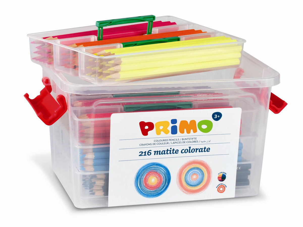 Pratica valigetta di matite colorate particolarmente indicate per uso scolastico, confezionate con 4 vassoi divisori contenenti complessivamente 216 pezzi (18 pezzi per 12 colori); diametro mina 3mm