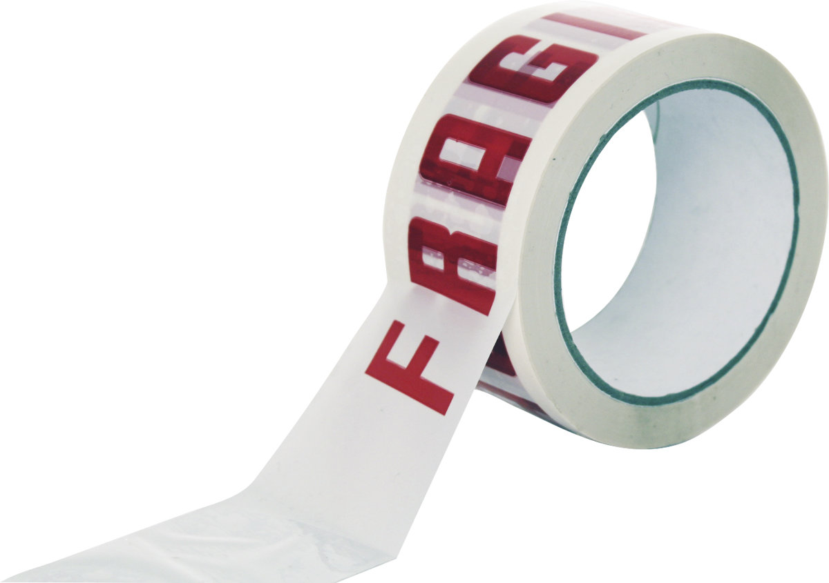 In polipropilene prestampato con dicitura FRAGILE (testo rosso su fondo bianco)