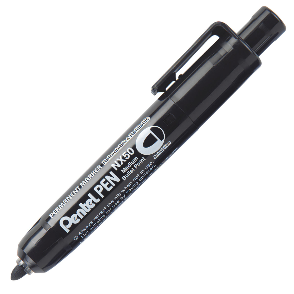 Pennarello a scatto con inchiostro permanente. Fusto in plastica nel colore