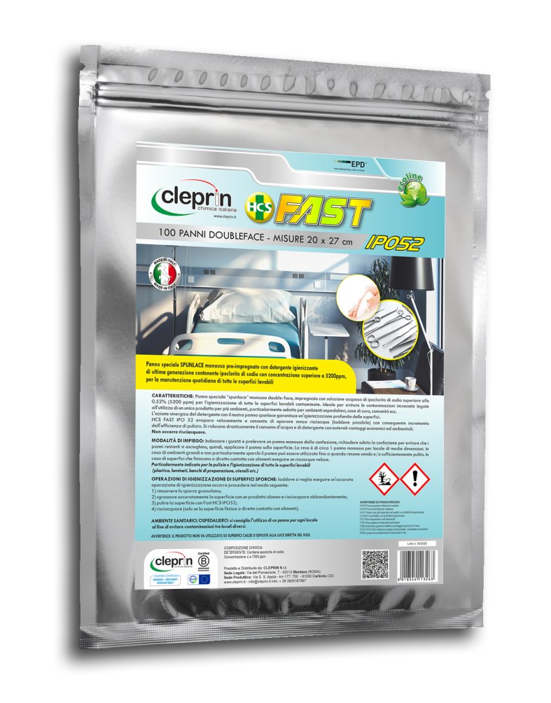 Il panno è impregnato con speciale formulazione a base di ipoclorito di sodio superiore a 5200 ppm