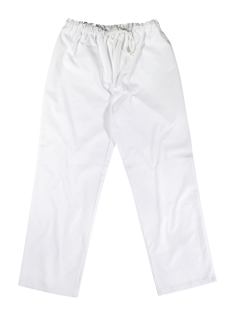 Pantalone bianco per industria limentare unisex. Elastico totale in vita con coulisse, senza tasche. Cucito con filo 100% poliestere a tre capi ad alta tenacità.
