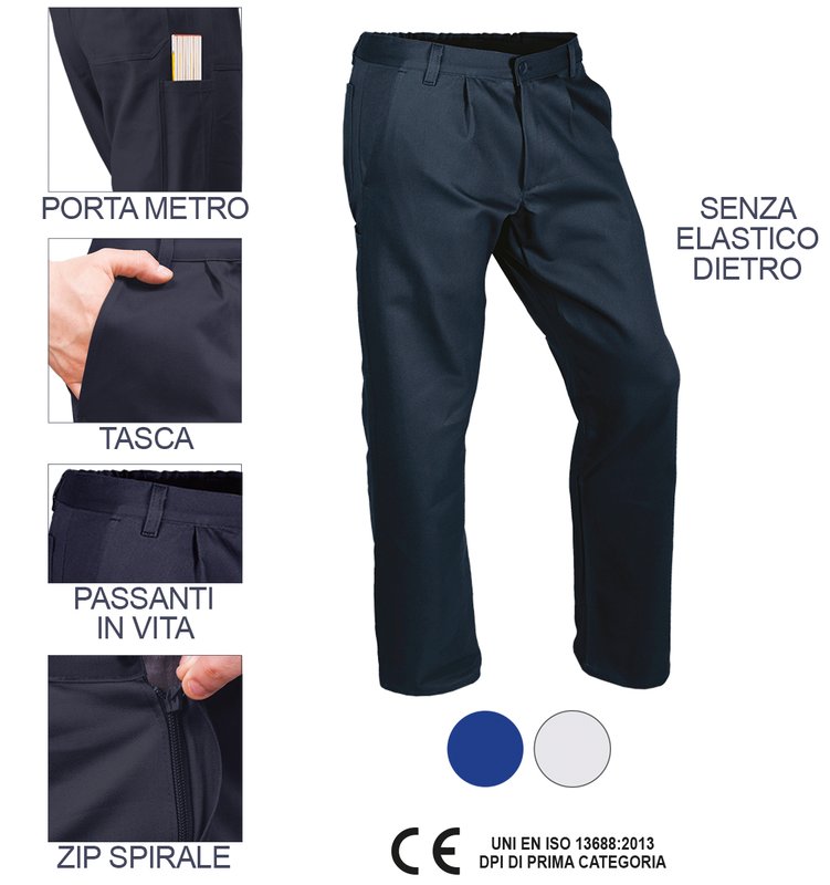Chiusura anteriore con bottone e zip spirale sei rinforzata coperta • due tasche all’americana • taschino posteriore chiuso con bottone • porta metro posteriore destro • cinque passanti in vita • elastico posteriore in vita • doppie cuciture rinforzate sul cavallo • tessuto sanforizzato calo massimo 2,5% • gabardine 210 gr/m² • 100% cotone • senza elastico dietro