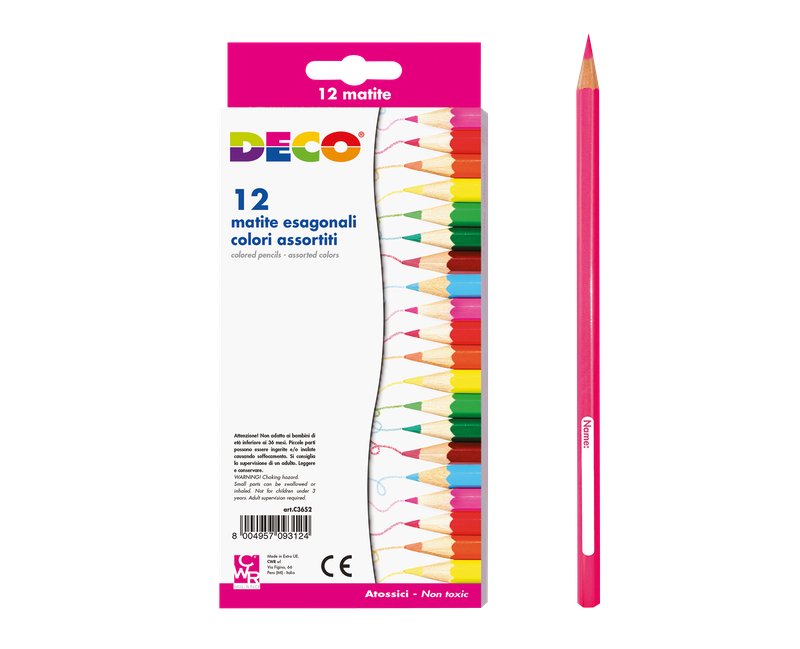 Lunghezza cm 17,5 • mina diam. mm 3 • fusto esagonale verniciato • utile spazio laterale per scrivere il proprio nome su ogni pastello • colori assortiti