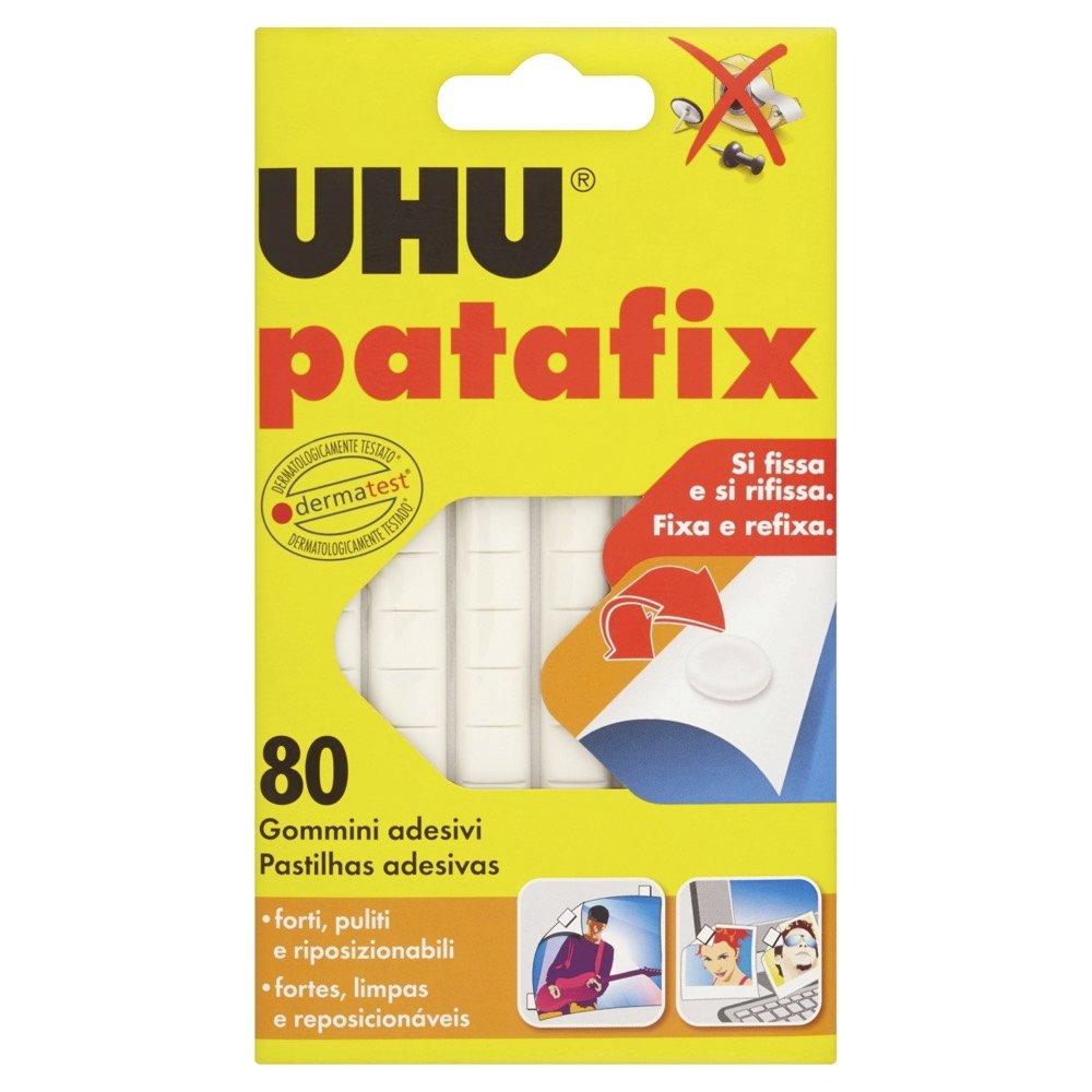 UHU Patafix Original è la soluzione ideale per fissaggi temporanei, veloci e puliti di piccoli oggetti (quali poster, cartoline, foto, memo, decorazioni) su varie superfici come pareti, porte o mobili