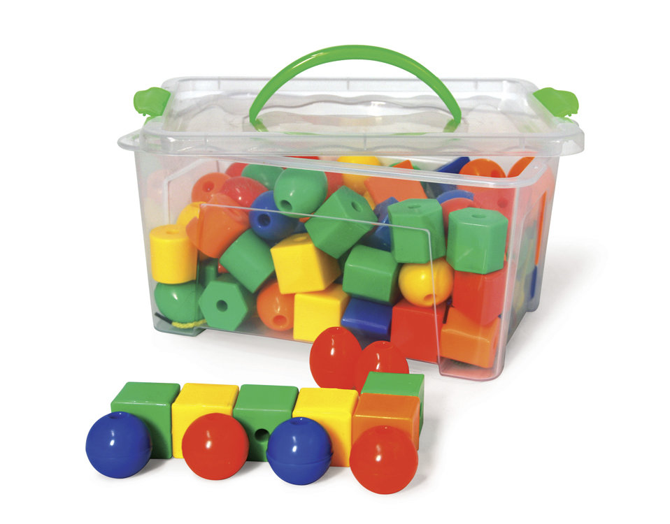 Bauletto contenente 100 perle grandi da 4 cm da infilare in forme e colori differenti