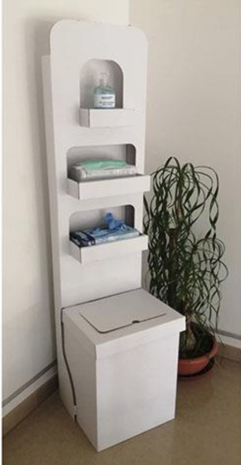 Piantana in cartone di colore bianco, con 3 mensole per posizionare gel igienizzante, confezione di guanti, veline, mascherine o altro