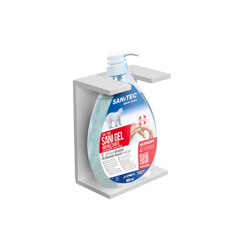 Può essere utilizzata con un dispenser di gel (non incluso), oppure con un supporto in metallo su cui inserire un flacone di gel Sanigel da ml 600