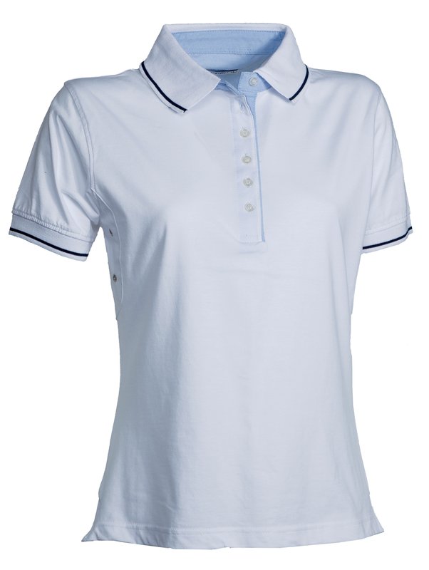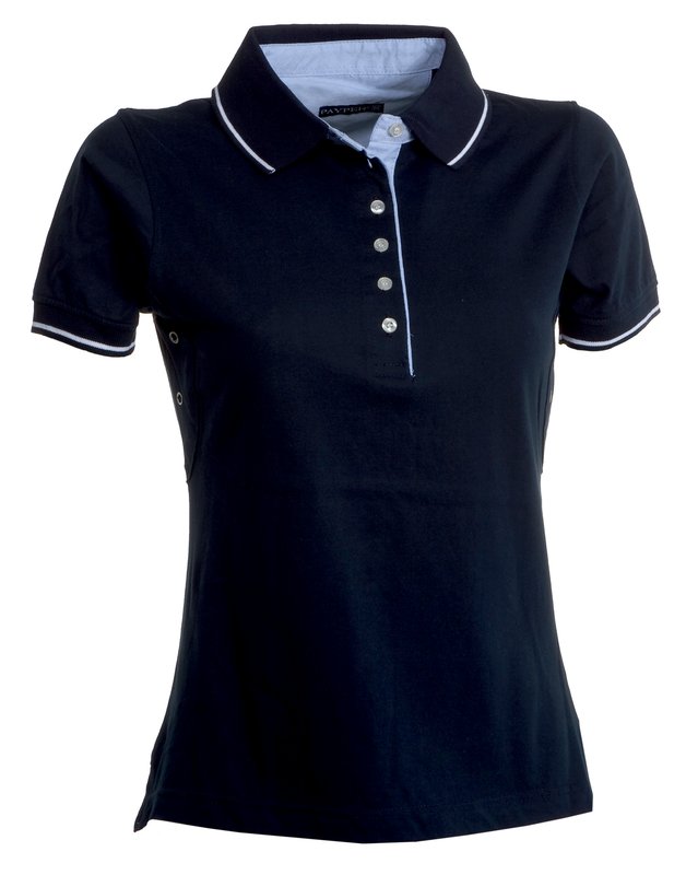 Polo donna sfiancata a manica corta a sei bottoni bianchi con interno collo • patta e spacchetti laterali in oxford celeste • colletto e bordo manica in rib con fine profilo a contrasto • occhielli sotto braccio • spacchetti laterali con cucitura di rinforzo • nastro di rinforzo laterale • cuciture stretch • rinforzo sagomato retrocollo COMPOSIZIONE: 100% cotone jersey pettinato tintura reactive dye GRAMMATURA: 175 gr/m² VESTIBILITÀ: casual fit