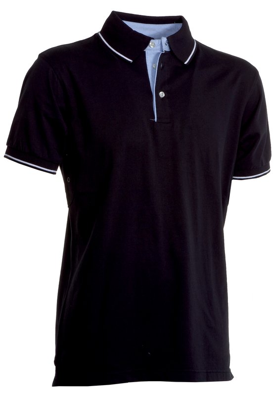 Polo da uomo a manica corta a tre bottoni bianchi • con interno collo • patta e spacchetti laterali in oxford celeste • colletto e bordo manica in rib con fine profilo a contrasto • occhielli sotto braccio • spacchetti laterali con cucitura di rinforzo • nastro di rinforzo laterale • cuciture stretch • rinforzo sagomato retrocollo. COMPOSIZIONE: 100% cotone jersey pettinato tintura reactive dye GRAMMATURA: 175 gr/m² VESTIBILITÀ: casual fit