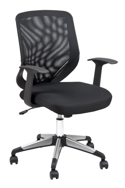Seduta con schienale in rete • seduta in multistrato di faggio e spugna riverstita in tessuto acrilico • elevazione a gas • meccanismo oscillante • schienale fisso • base in nylon con particolari cromati • completa di braccioli fissi • dimensioni: altezza cm 93/102, altezza seduta cm 44/53, profondità seduta cm 48, larghezza seduta cm 51