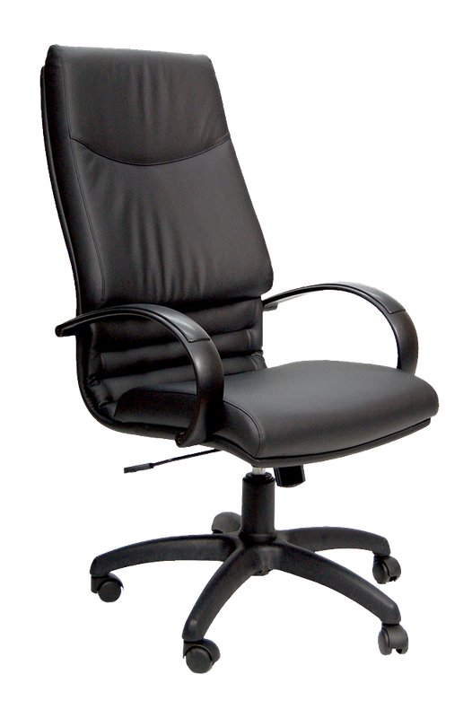 Schienale alto • seduta in multistrato di faggio e spugna rivestita in pelle nera con retro in skay • meccanismo oscillante con blocco • elevazione a gas • base in nylon nero • completa di braccioli • dimensioni: altezza cm 114/123, altezza seduta cm 45/56, profondità seduta cm 48, larghezza seduta cm 50