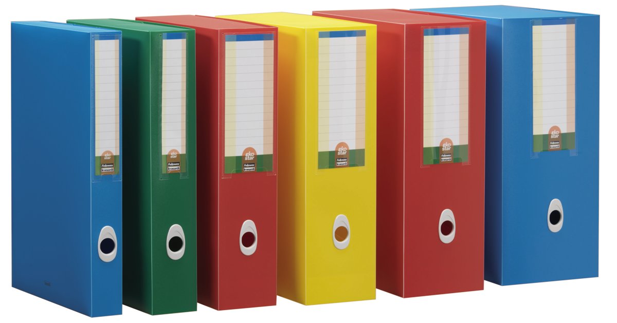 Realizzato con materiale plastico Ekostar di diversi spessori in base al dorso del portaprogetti: 07 mm nei dorsi da 4 e 6 cm, 0,8 nei dorsi da 8 e 10 cm e 0,9 mm nei dorsi da 12 e 15 cm