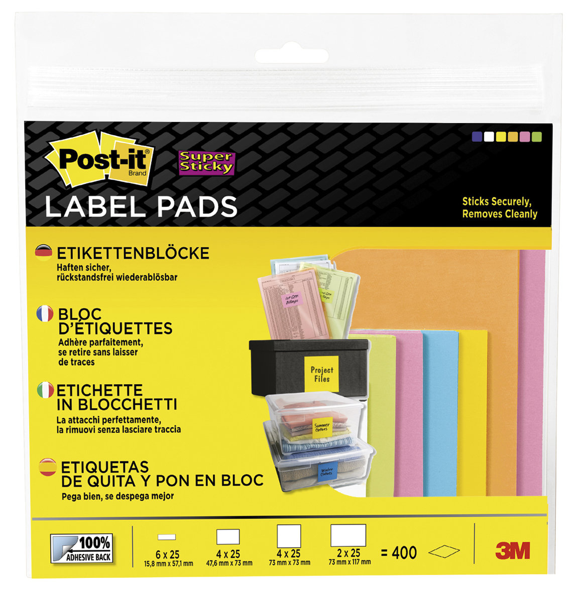 Etichette super adesive riposizionabili in blocchetti, ideali per personalizzare cartelle, raccoglitori, quaderni e scatole in modo non definitivo ma resistente