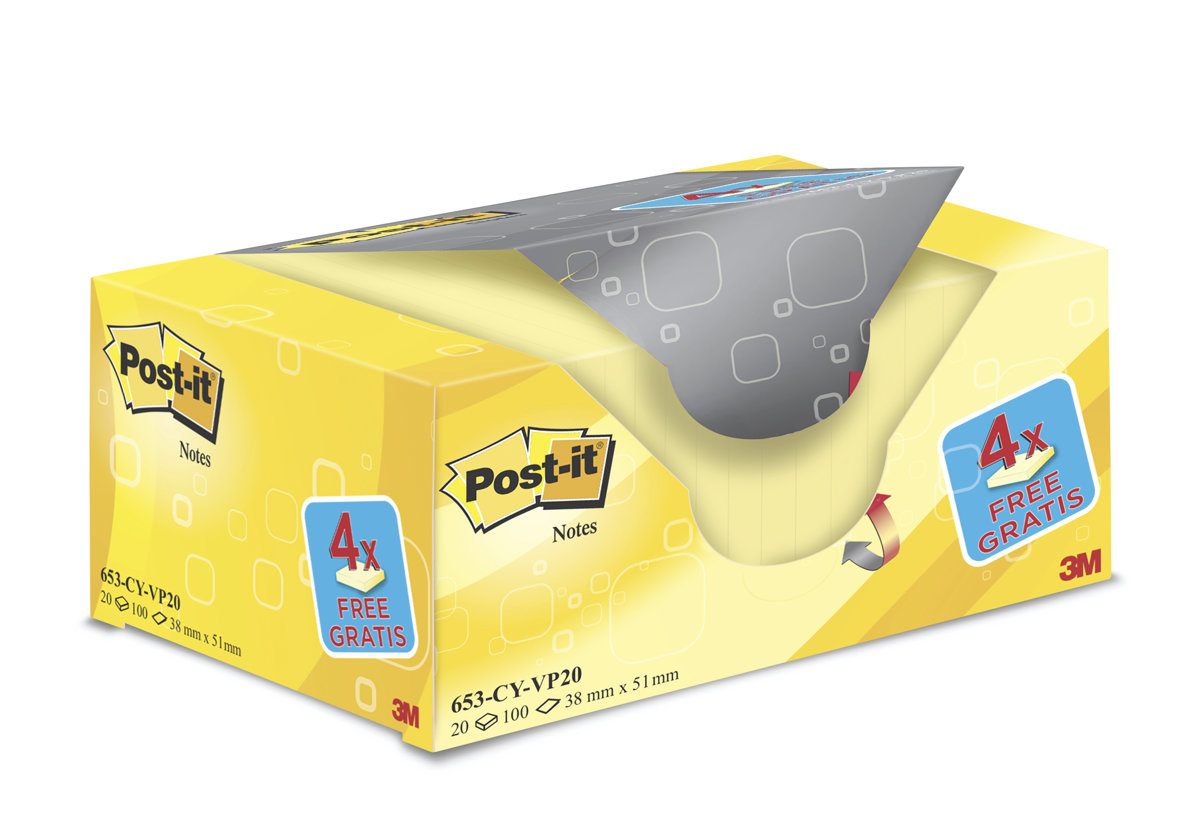 Scegliere Post-it® in grandi quantità conviene! Queste pratiche confezioni di foglietti Post-it® colore giallo Canary contengono 20 blocchetti da 100 fogli (di cui 4 blocchetti in omaggio) nelle dimensioni 38mm x 51mm, 76mm x 76mm e 76mm x 127mm