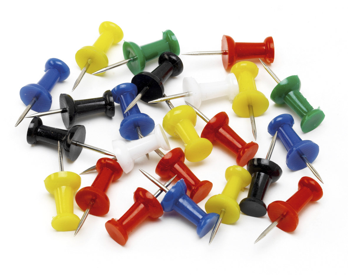 Fermafogli realizzati in abs in colori assortiti con punta in acciaio, ideali per pannelli in sughero e in feltro