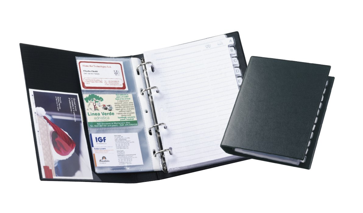 Rubrica alfabetica a 4 anelli realizzata in soffice colpan nero, completa di schede con tacche A-Z e di buste porta biglietti da visita