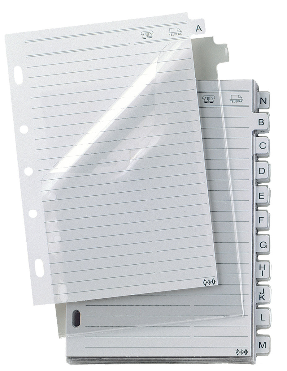 Rubrica alfabetica a 4 anelli a D realizzata in colpan nero, completa di 22 schede in cartoncino con tacche A-Z e relative buste trasparenti