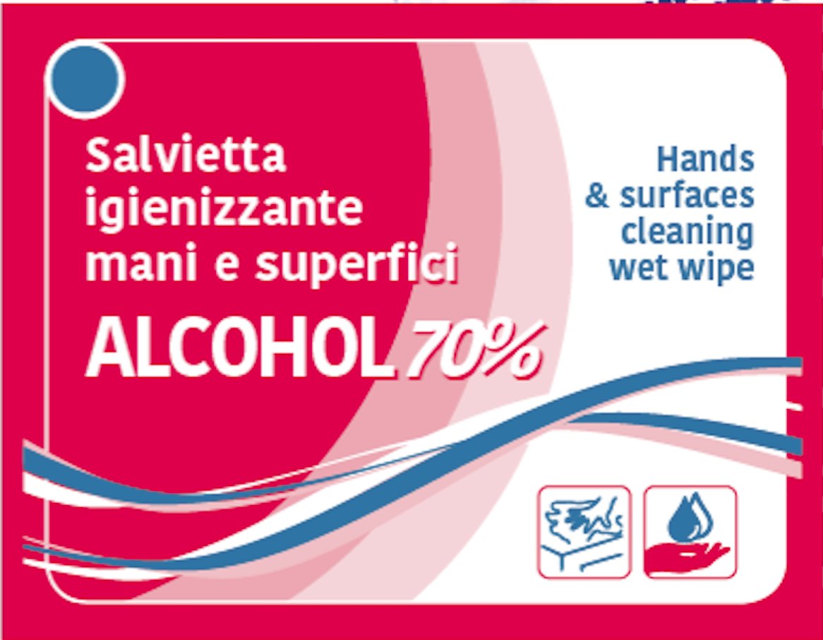 Salvietta umidificata a base di alcohol (70%), realizzata per rispondere con efficacia alle misure per il contenimento del virus in modo pratico e comodo