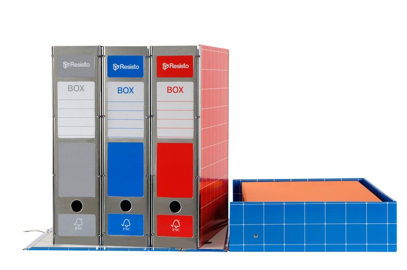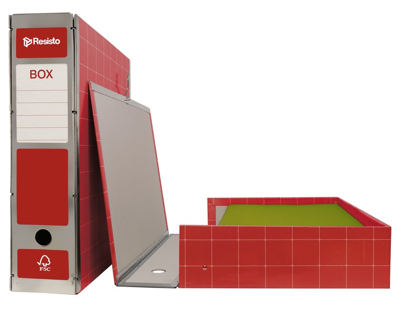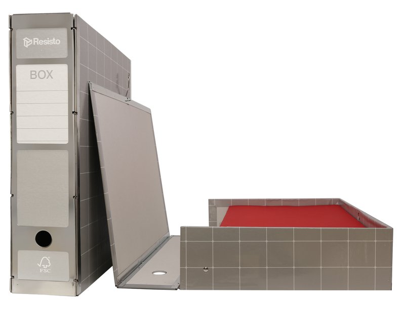 Scatole archivio ad apertura totale • realizzate in cartone ad alto spessore rivestito con carta monopatinata • lati corti in pannelli di legno rivestiti in tinta • cerniere e profili in metallo • anello di estrazione • formato esterno cm 29,5x37,5x9