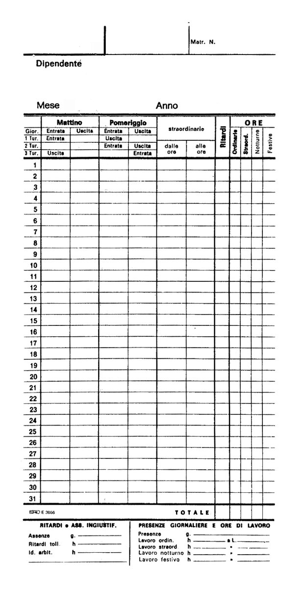 100 schede rileva presenze del personale, per orologio (tipo Solari), controllo mensile