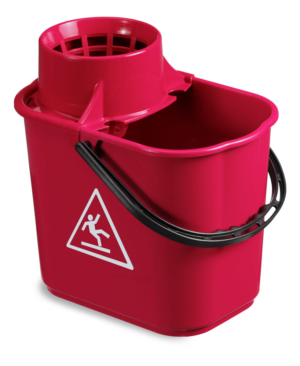 Secchio Easy in polipropilene completo di strizzino removibile, maniglia in plastica, serigrafia di avvertenza su entrambi i lati e bordino salvafondo