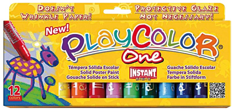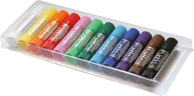 Nuova tempera in stick adatta ai bambini di età superiore a tre anni • si usa senz'acqua e senza pennello • effetto pastello a cera se usato con poca pressione, effetto tempera se si preme con più forza • alta coprenza • non inumidisce il foglio di carta evitando di generare l'effetto ondulato • asciugatura rapida • lavabile dalla maggior parte dei tessuti • colori assortiti