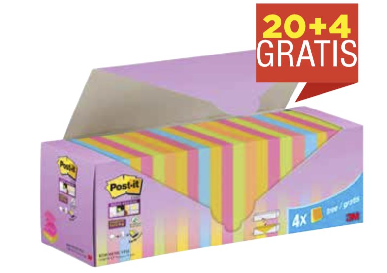 Ricariche di foglietti Post-it® Super Sticky Z-Notes in colori assortiti in confezione convenienza da 20 blocchetti + 4 gratis