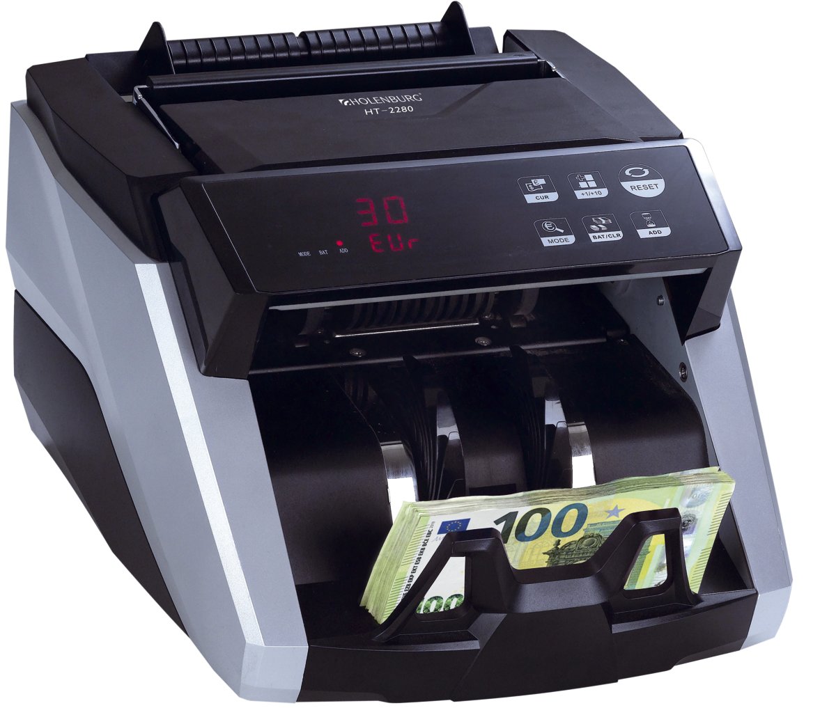 Principali funzioni: Batch (permette di impostare conteggi di un determinato numero di banconote al raggiungimento del quale la macchina si arresta e riparte automaticamente dopo aver rimosse le banconote dal vassoio di raccolta), Add (permette di effettuare conteggi consecutivi sommandoli), Cur (permette di selezionare la valuta delle banconote che si vuole verificare e/o contare)